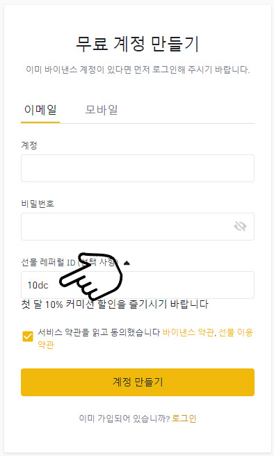 바이낸스 선물 거래소는 간단하게 이메일 인증만으로도 가입이 가능합니다. 추천인 코드를 입력하고 가입해야 수수료 10% 할인을 받을 수 있습니다. 링크에 클릭하고 선물 레퍼럴 ID에 "10dc"를 입력하시고 가입하시면 수수료 10% 할인을 받습니다. 바이낸스 선물 거래소 가입하기>