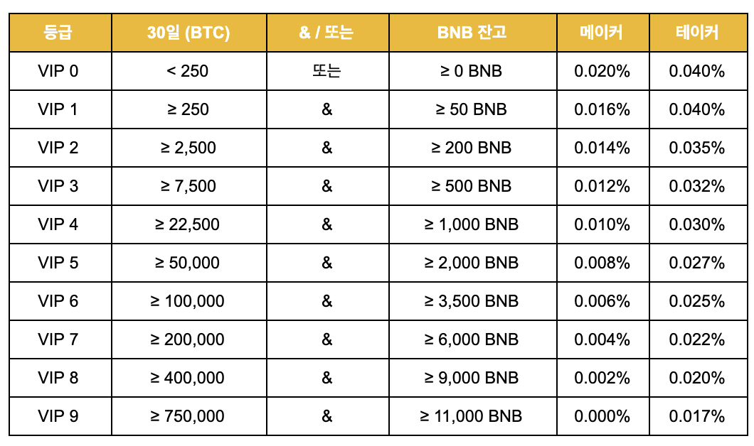 바이낸스 거래 수수료를 알아보자면 선물 수수료는 다음과 같습니다.
