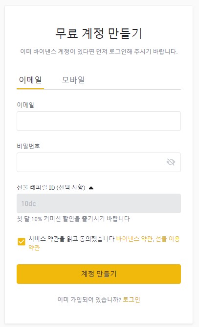 바이낸스 퓨처스사용하고자 하는 이메일 주소를 입력하고, 안전한 비밀번호를 지정합니다. 추천인 ID에 '10dc'를 입력하면 거래 수수료 10%를 할인받을 수 있습니다.