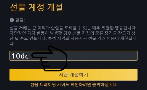바이낸스 선물 페이지로 이동하면, 오른쪽 상단에 로그인이 되어있는지 확인하고 오른쪽 아래에 "개설하기" 버튼을 클릭해 바이낸스 퓨처스/선물 계정을 활성화합니다. 레퍼럴 아이디 '10dc' 를 입력해야 수수료 10% 할인을 받을수 있습니다.이제 개설이 완성되었고 거래할 준비가 완료된 것입니다.