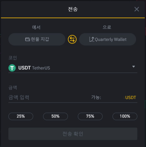 일반 현물 거래소 지갑과 선물/마진지갑(바이낸스 선물에서 사용하는 지갑) 간에 자금을 이동할 수 있습니다.