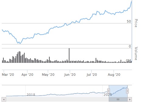 코로나 바이러스 록다운으로 온라인 쇼핑 이용자가 증가하고 있는데요 온라인 결제가 급증하며 같이 오른 것이 또 하나 있는데 바로 BNPL (Buy Now Pay Later) 종목 주가입니다. BNPL 바이나우 페이레이터 즉 선구매 후 결제로 무이자 할부를 제공하는 서비스인데요. BNPL 대장주 애프터페이 Afterpay 주식을 3월에 $10,000 사셨으면 현재 10배 오른 $100,000이 되었을 겁니다.