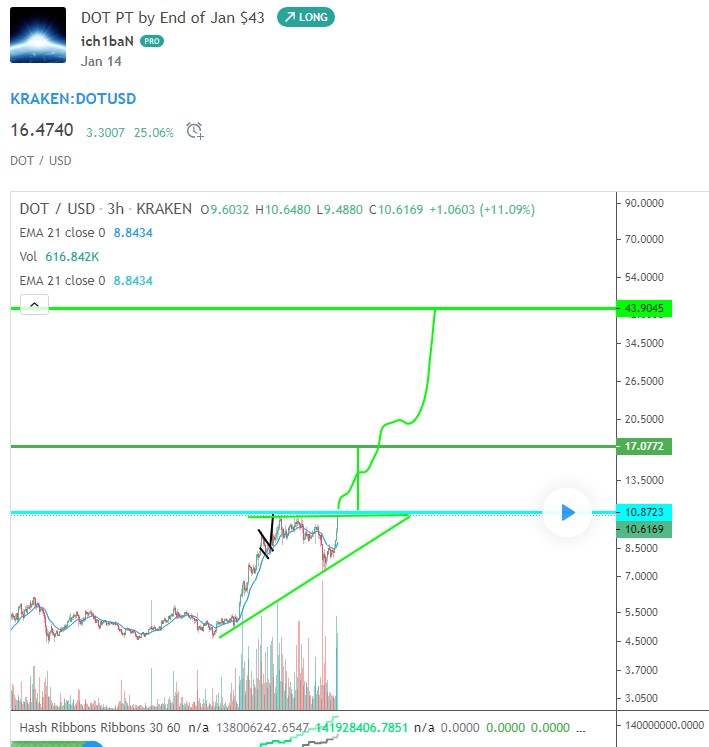 해외 가상화폐 커뮤니티에서 다양한 폴카닷 코인 가격 전망이 나오고 있는데요, 이치반이란 애널리스트는 1월 말까지 $43까지 올라간다고 예상하고 있고 MrBusiness라는 트위터 유저는 아직 코인베이스에 상장되지 않았고 세계 최대 암호화폐 자산운용사 그레이스케일 상품에 포함되지 않았다는 이유로 장기적으로 $100까지는 왜 못 가겠냐?라는 낙관적으로 전망하고 있습니다.