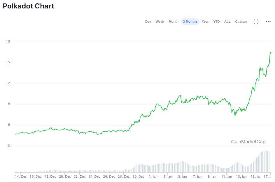 폴카닷코인 시세를 보면 지난 12월 28일 약 $5에서 1월 16일 (바이낸스 기준) 약 $17까지 3주 만에 3배 이상 오른 가격이다. 시가총액으로 보면 146억만 달러 약 16조원 가상화폐 시총순위 비트코인, 이더리움, 테더 다음으로 4위까지 올라왔다.