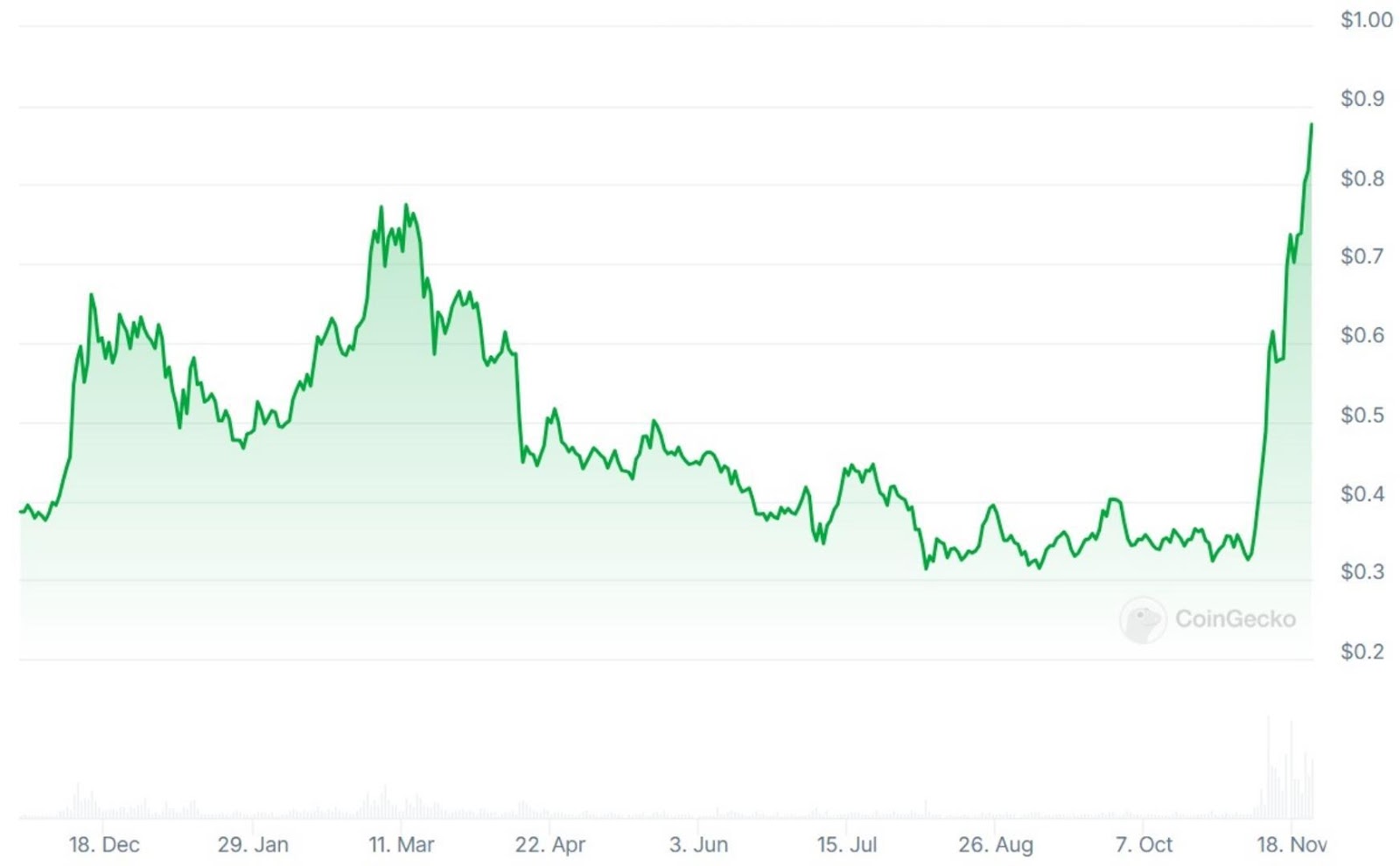밈 코인의 선구자인 도지코인은 여전히 활발한 커뮤니티와 함께 성장하고 있습니다. 최근 도널드 트럼프가 '정부 효율성 부서(D.O.G.E)'를 설립할 계획을 발표하며 도지코인은 다시 한번 큰 주목을 받았습니다. 가격은 트럼프의 당선 이후 2주 만에 99.4% 급등했습니다.