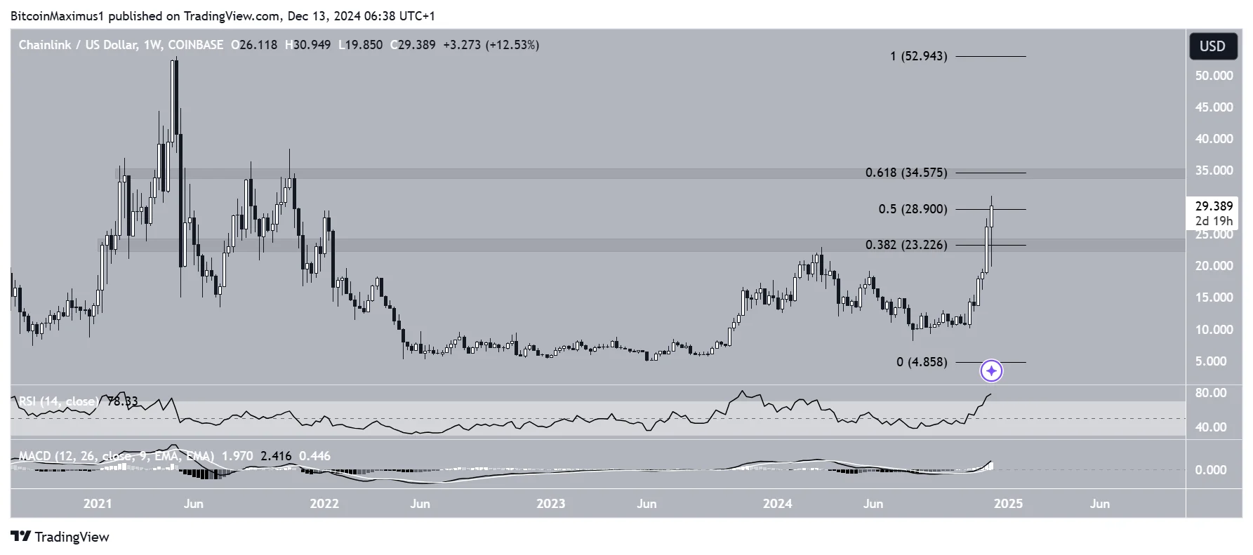 11월에만 70% 상승한 LINK는 12월에도 추가로 52% 상승하며 $30.94로 정점을 찍었습니다. 이 상승세는 주요 기술적 저항선인 $23.22를 돌파한 이후 가속화되고 있습니다. 현재 $28.90의 저항선 부근에 있지만, 이를 넘어설 경우 $34.50까지 상승 가능성이 있습니다.