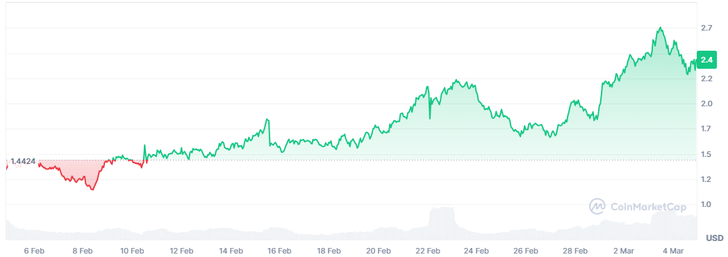 Grass 코인은 2024년 10월 출시 이후 빠르게 성장하며 투자자들의 관심을 끌었습니다. 현재(2025년 3월 4일) Grass 코인의 가격은 약 $2.45(바이비트 기준)로, 24시간 동안 -2.08% 변동을 보이고 있습니다. 과거 최고가는 2024년 11월 8일 기록한 $3.89, 최저가는 2024년 10월 28일 $0.65였죠. 이처럼 Grass는 짧은 시간 안에 큰 변동성을 보여줬습니다.