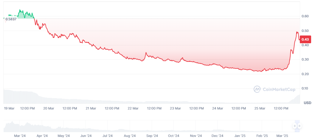 2025년 3월 25일 기준으로, Mavia 코인의 가격은 약 $0.44 USD 수준에서 거래되고 있습니다. 이는 과거 최고가인 $10.79 (2024년 2월 18일)와 비교하면 상당히 하락한 수치지만, 최저가 $0.09566 (2025년 3월 11일)에서 반등하며 회복세를 보이고 있습니다. 현재 시가총액은 약 $26.66M USD로, 전체 암호화폐 시장에서 #721위 중소형 코인으로 분류됩니다.