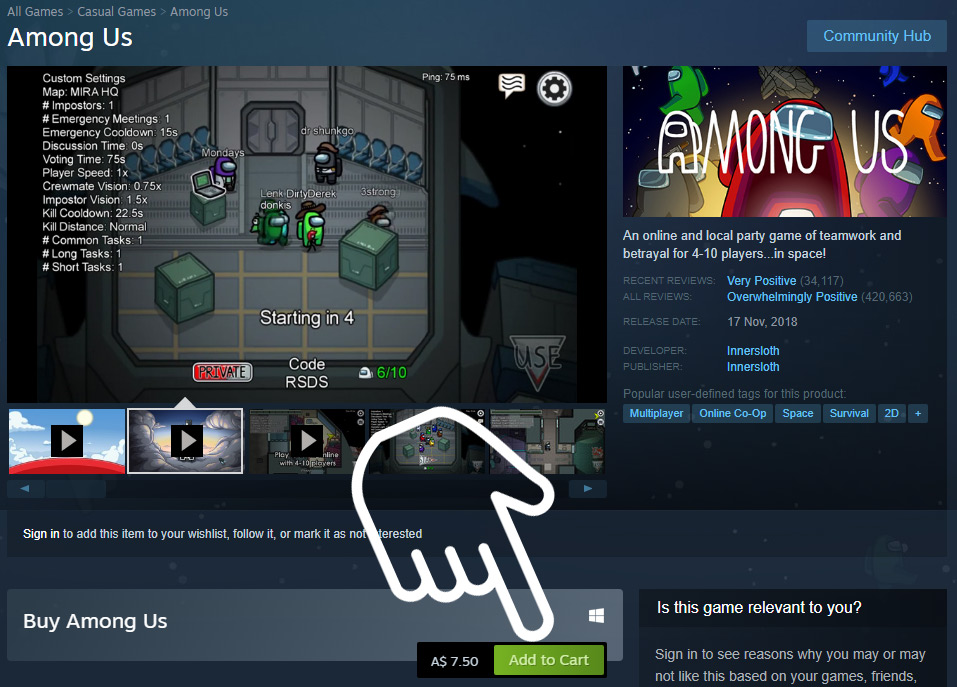어몽어스 PC버전은 스팀 스토어에서 다운로드할 수 있습니다. 가격은 5,500원입니다. 모바일은 무료이지만 게임이 끝나고 광고가 나옵니다. 스팀 바로가기>